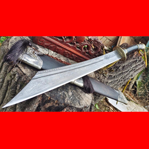 商品简介:这把刀由户撒刀迪派传人线乔发全手工锻造,刀条采用优质特硬百炼花纹钢手工锻打完成,线乔发独到的祖传淬火工艺让刀条刃口硬度极高并刚柔相济!粗锋砍断钢筋也不在话下!刀条形状为经典斩马刀形制,此刀为斩马刀加宽加大版本,更突出了刀的强悍威力!刀条的一体全龙骨设计让刀身强度大大加强,保证刀条在正常使用情况下永不断裂!刀鞘和刀柄为进口黑檀木手工制作,根据刀条形状刻刀槽,使得刀入鞘后不会晃动,也避免了由于松动而引起的刀使刀鞘受到损伤,刀鞘外部精包做旧缅银,使得此刀更显古朴大气!户撒刀收藏必不可少!