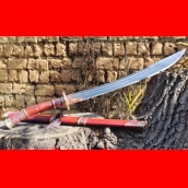 商品简介:此刀为户撒优秀匠人全手工锻打的一体全龙骨牛尾刀,“牛尾刀”是中国清代晚期官衙差役配备的制式武器,因刀刃朝上斜放着很像牛尾因此而得名。现在它不仅被现在广大武术爱好者用做习武之用,也几乎成了所有漫画和影视作品中古代中国刀的代表性形象了。这把刀采用优质高碳锰钢纯手工千锤百炼而成,刃口坚硬锋利,斩铁截钉不在话下,甚至超越了古代冷兵器的性能范畴,刀柄刀鞘为优质红酸枝手工制作,严丝合缝,木鞘外部包优质紫铜配件,更增加了此刀的观赏和收藏价值,收藏、把玩、实用一体的精品户撒刀!