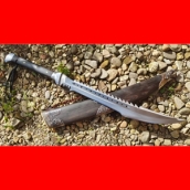 商品简介:这款是客户特殊定制的一款全龙骨长砍刀“史前巨鳄”,采用军用车弹簧板纯手工锻打而成,一体全龙骨的刀身造型新颖独特,峥嵘凶猛,让人看了不寒而栗!整个刀条全龙骨手工锻造,性能极佳,劈砍力度非常强,胳膊粗的竹子随手砍断,黑檀木的刀鞘和刀柄外包缅银而成,古朴大气收藏性观赏性也大大增强,此刀加工难度很高,工期长,不过客户收到极为喜欢视为珍宝!欢迎广大朋友收藏订购!