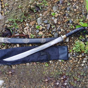 种材料,这款苗刀款式极具民族特色,刀身线条流畅劈砍有力顺畅,可以在刮毛的同时砍铁不伤,刀柄刀鞘为优质黑檀木手工制作,风格古朴大气具有很高的收藏和实用性。