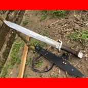 商品简介:这款刀刀型采用经典的蝎子战刀原型,刀身采用军用解放车弹簧板手工锻打,刚柔相济性能强悍,刀型霸气犀利,可刺可砍,威力强大,过竹砍铁不在话下,轻松穿铁皮桶,一体全龙骨锻造结实耐用!