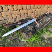 商品简介:这是给客户加工好的一把剑中的巨无霸,一体全龙骨锻打!从业以来最大的一把剑,刃长88厘米 全长122厘米 宽度6厘米,护手和尾端为紫铜制作,铜件为客户自行邮寄过来,只是铜件的制作就价格不菲,整个剑不带剑鞘达到二十斤,十分的巨大,定此宝剑的客户为当地一家知名健身馆教练,十分喜爱重型冷兵器,这把宝剑做工精细并且霸气难掩!实在是剑中之王!