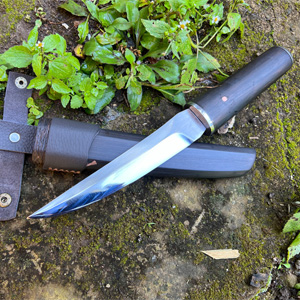 商品简介:这款短刀是一把便携猎刀,刀条用坦克销钉锻打而成,刀型设计严谨,穿刺切削一流,按照当年台湾匠人陈朝波给美国海豹突击队设计的刀条款式锻打而成,刀性能一流!