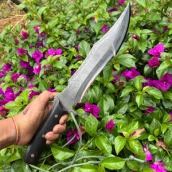 商品简介:这款刀钢材采用流水团纹大马士革钢手工锻打,锻打后配发淬火而成,性能强悍斩铁截钉,这款刀造型美观犀利并且独特,穿刺和劈砍能力俱佳!黑檀木手柄贴片手工相当舒适!